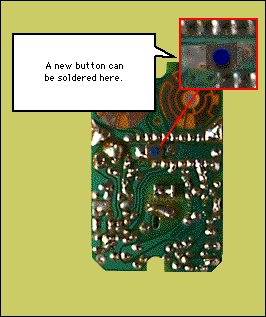 A new button: The metal piece can be completely removed and a new surface mount switch soldered directly to the circuit board. There are a number of switches that will fit in the space. Many of the electronics mail order suppliers such as Digikey carry them. I chose part number PB-73 from All Electronics (thank you to Jim Griggers for the source). Either the switch or the circuit board must be modified slightly for this to fit. I chose to modify the switch because it's quicker. Simply cut off two of the switch leads diagonal from each other then solder the remaining leads to the contacts on the circuit board. Your may need to use a knife to remove what's left of the nub on the end of the plastic plunger so it doesn't stick down too far. After everything is assembled you will have a wall switch with a light touch and a nice tactile feel.