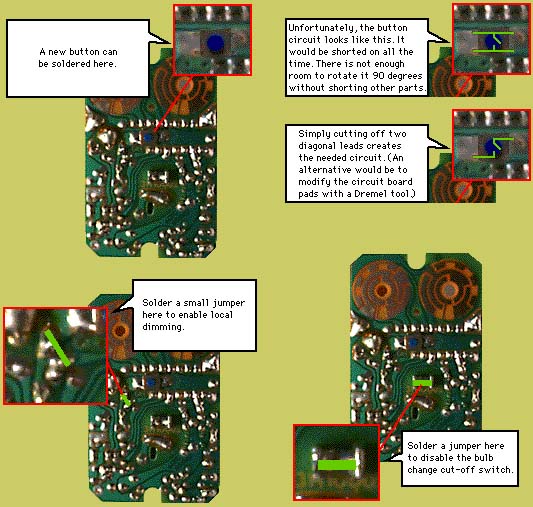 Bulb change disable: You can also fix that pesky slide switch below the push button. It's intended to cut all power to the light when you can change the bulb. But they always seem to get slid over to the off position and my lights don't work as expected. Most of us change a light bulb occasionally with the power on anyway, so I disable the feature. Soldering a jumper between the contacts will fix it and save you from having to reinstall the little metal contact that activates it. I usually just cut a chunk of the metal contact and solder that in place.